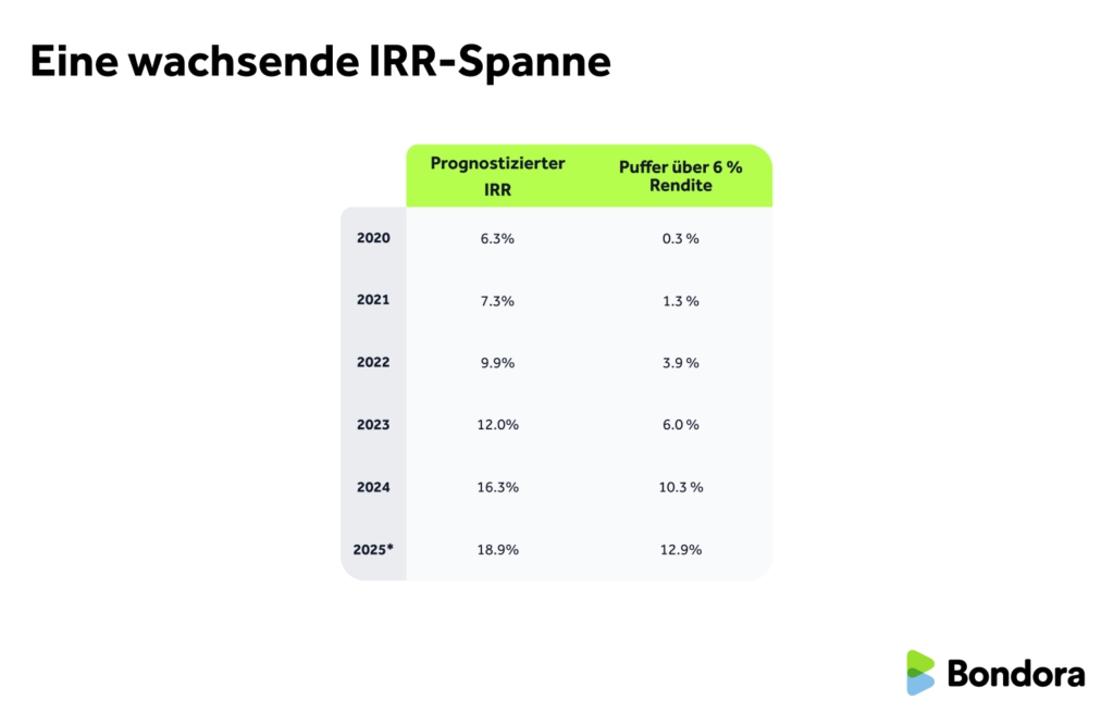 Selbst bei Berücksichtigung von Zahlungsverzügen und Beitreibungsprozessen zeigt unser prognostizierter IRR weiterhin eine gesunde Spanne gegenüber der Go & Grow-Zielrendite von 6 %.