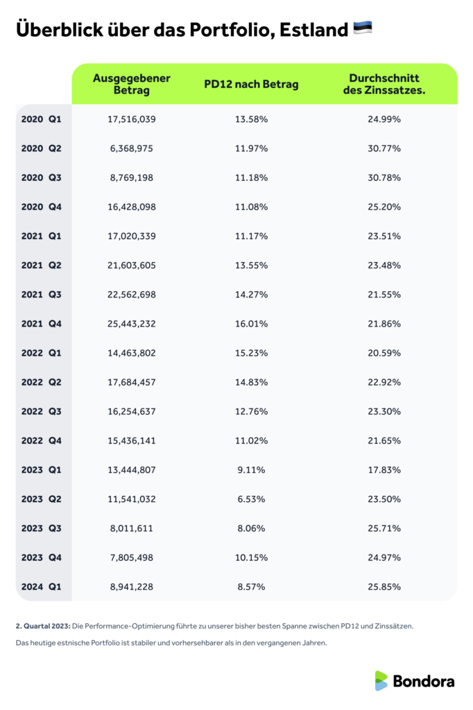 Die Entwicklung von Bondora zeigt, wie Lernen zu Wachstum führt. Die Herausforderungen der vergangenen Jahre haben bessere Systeme, intelligentere Risikomodelle und stärkere Performance mit sich gebracht. Unsere Abläufe werden jetzt durch niedrigere Verzugsraten und ein robustes Risikorahmenwerk definiert.
