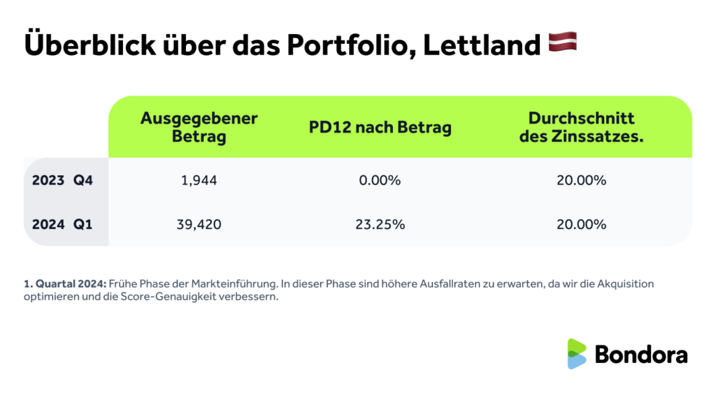 - 1. Quartal 2024: Frühe Phase der Markteinführung. In dieser Phase sind höhere Ausfallraten zu erwarten, da wir die Akquisition optimieren und die Score-Genauigkeit verbessern.