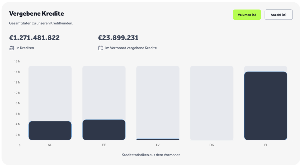 Die überarbeitete Statistikseite bietet einen aussagekräftigeren Überblick über die wichtigsten Daten von Bondora, von der Anzahl der Investoren bis hin zu Einblicken in das Kreditportfolio. Ganz gleich, ob Sie die Aktivitäten der Kreditnehmer, die Gesamtinvestitionen oder die Renditen verfolgen möchten: Der Zugriff auf diese Informationen erfolgt jetzt in einem Format, das einfacher zu navigieren ist und regelmäßig aktualisiert wird.