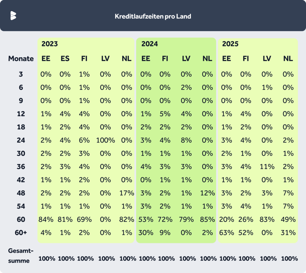 Unsere Kreditkunden bevorzugen in der Regel längere Kreditlaufzeiten, da die monatlichen Zahlungen so überschaubarer sind. Durch das Angebot längerer Laufzeiten werden mehr Kreditvergaben bei geringerem Risiko ermöglicht, während gleichzeitig ein höherer Prozentsatz an fristgerechten Rückzahlungen beibehalten wird.