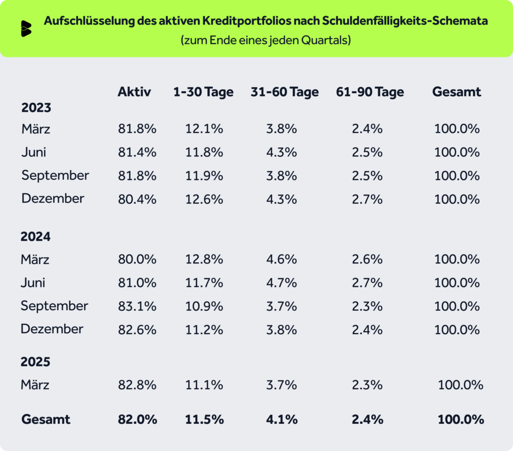 Unser aktives Kreditportfolio ist konstant stabil geblieben, wobei über 80 % der Kredite in allen Zeiträumen aktiv geblieben sind. Das Niveau der Zahlungen, die in Verzug sind, haben in den verschiedenen Fälligkeitstage-Schemata nur geringfügige Schwankungen gezeigt, was auf einen stabilen Portfolio-Zustand hinweist.