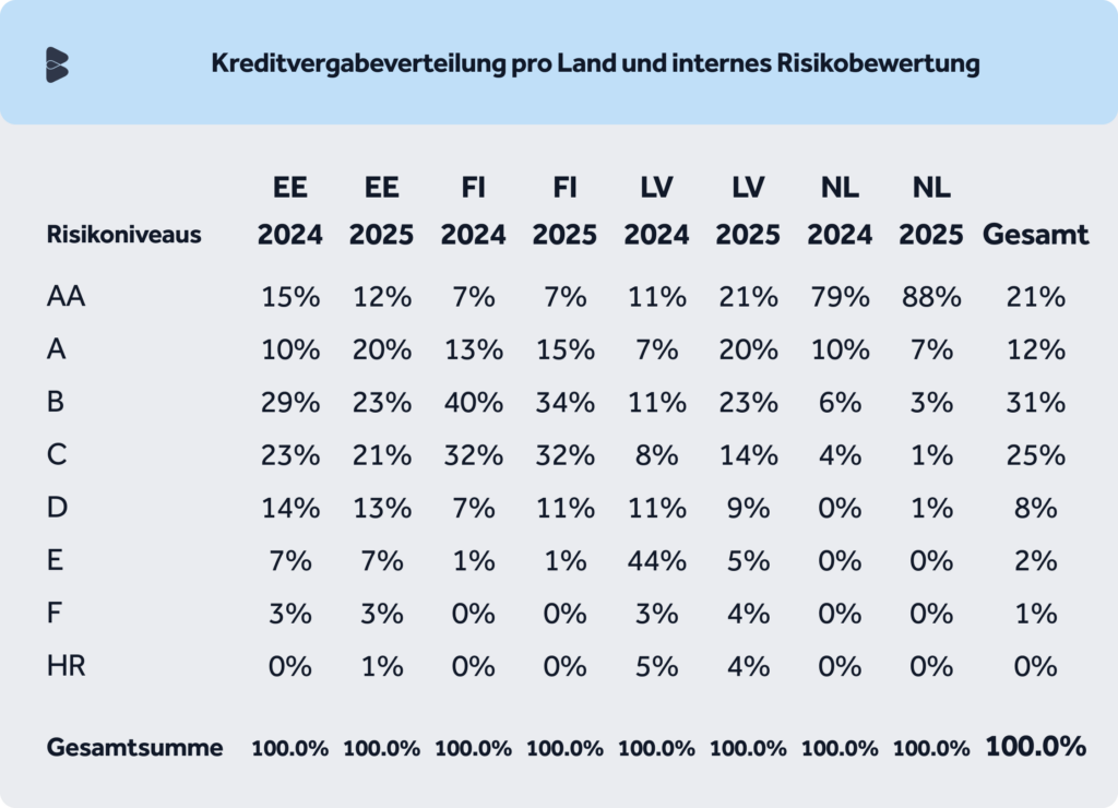 Die Mehrheit unserer Kreditneuvergaben fällt in den Bereich der niedrigen Risikostufen. Wir verfolgen weiterhin einen umsichtigen Ansatz beim Risikomanagement, indem wir den Anteil der Kredite in den Risikokategorien AA-C in allen Märkten erhöhen.