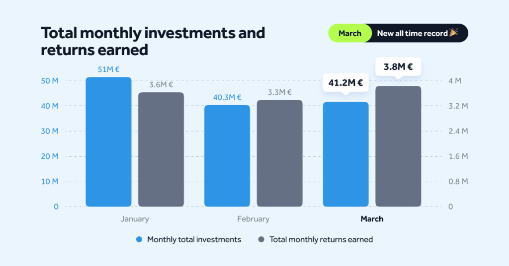 Returns paid out to investors reached a new peak. During March, investors earned €3,779,278, setting a new all-time record payout.
