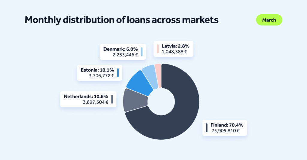 Lending activity increased further in March, with total loan originations reaching €36,791,920. This represents a new all-time high and highlights continued demand across Bondora’s European markets.