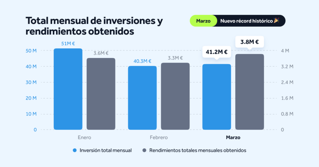 Los rendimientos abonados a los inversores alcanzaron un nuevo máximo. Durante marzo, los inversores obtuvieron 3.779.278 €, estableciendo un nuevo récord histórico de pagos.