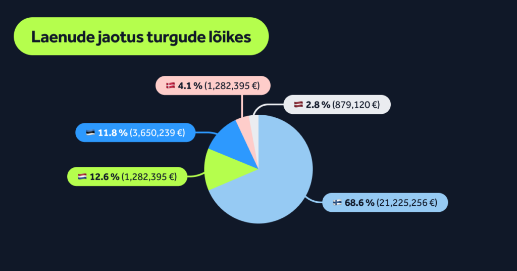 - 🇫🇮 Soome: tegu on jätkuvalt meie suurima laenuturuga, kus väljastati 21 225 256 € väärtuses laene, mis moodustab 68,6% kogu kuumahust.