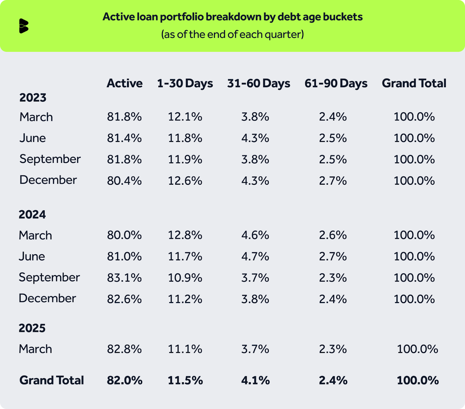 Our active loan portfolio has remained consistently stable, with over 80% of loans remaining active across all periods. Delinquency levels across different aging buckets have shown only minor variations, indicating strong portfolio health.