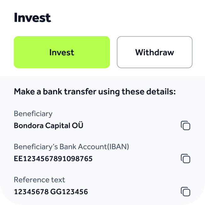 Quando i tuoi amici effettuano la registrazione utilizzando il tuo link di riferimento unico Bondora, ricevono un bonus d’ingresso di 5 €. Se loro investono 50 € o più durante i primi 30 giorni, tu riceverai un bonus di 5 € per aver segnalato l’amico. Si applicano Termini & Condizioni.