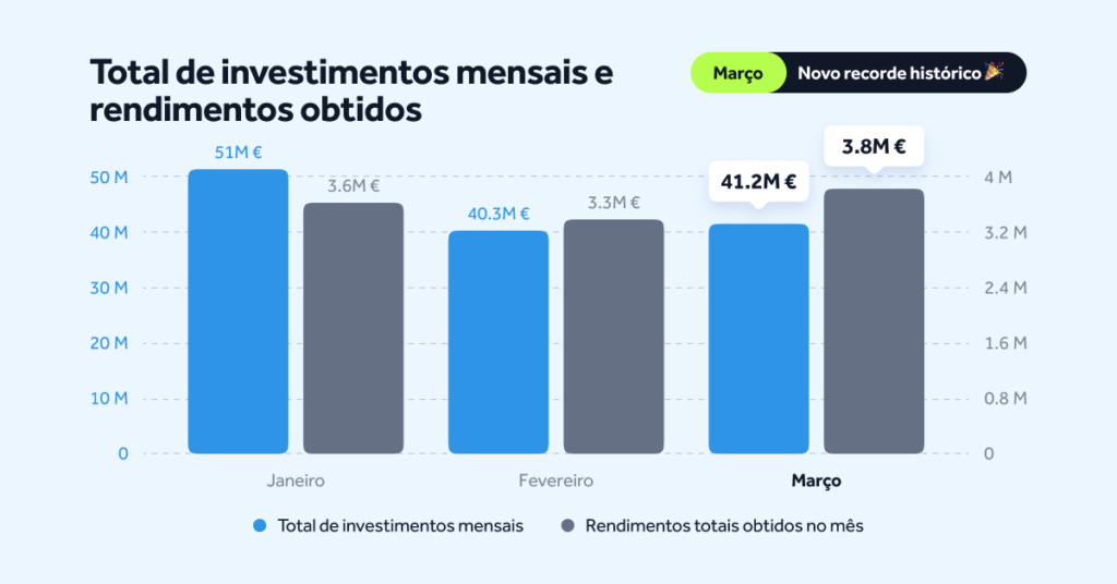 Os rendimentos pagos aos investidores atingiram um novo pico. Durante o mês de março, os investidores receberam 3 779 278 € em rendimentos, estabelecendo um novo recorde histórico de pagamentos.